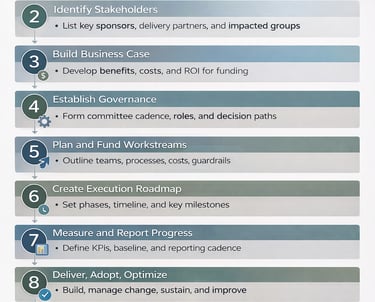 Stakeholders are not an afterthought. I identify sponsors, delivery teams, impacted groups, and decision authorities upfront. Clear roles and communication paths prevent confusion and accelerate progress.